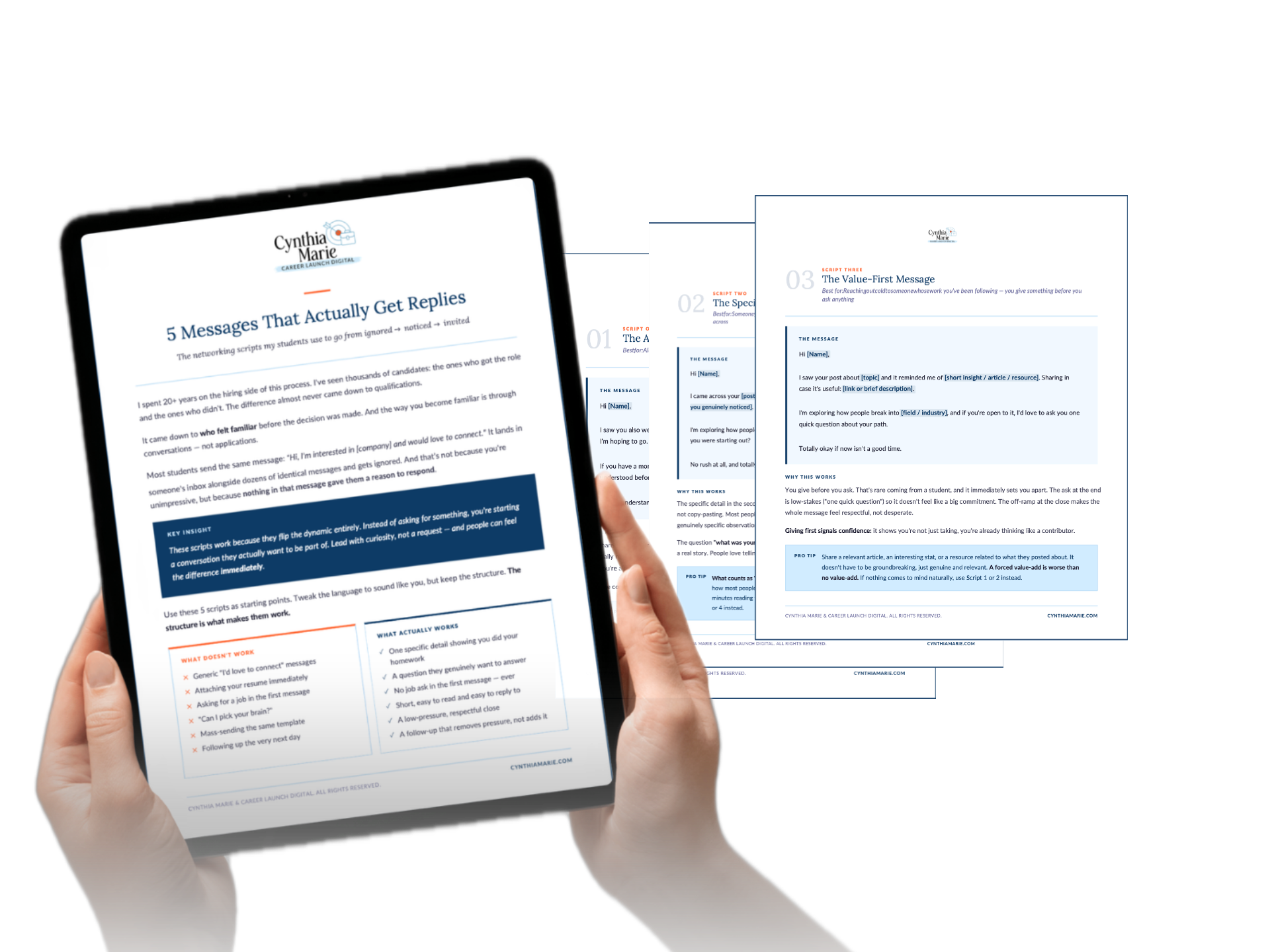 You've been applying. You've been waiting. The problem probably isn't your resume... It's that nobody inside those companies knows your name yet. This free guide gives you the exact message scripts my students use to start real conversations that turn into referrals, interviews, and offers.